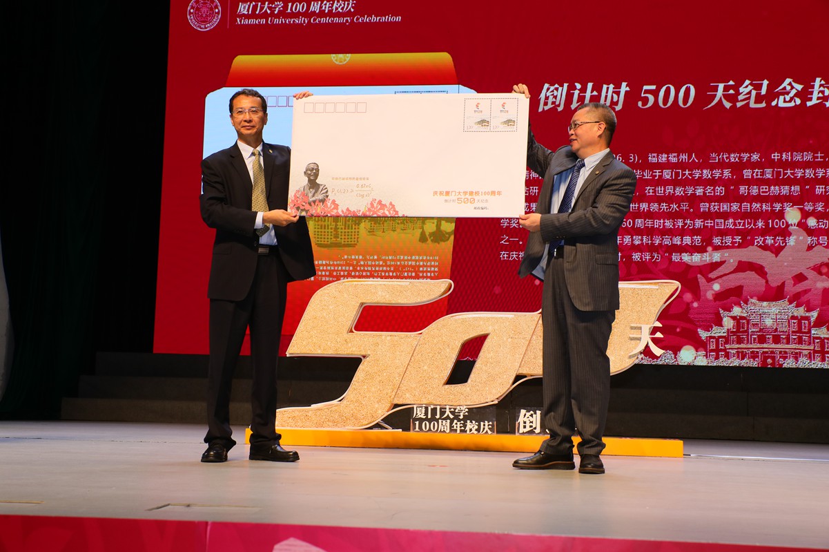 随后,举行厦门大学100周年校庆倒计时500天纪念封首发仪式。赖虹凯、叶世满为纪念封揭幕。百年校庆系列纪念封以学校“四种精神”代表人物为设计元素,将在百年校庆到来之前陆续推出5个纪念封。倒计时500天推出的纪念封以陈景润先生为杰出代表的厦门大学科学精神为主要元素,正面印有陈景润先生的铜像及其哥德巴赫猜想的公式,右上角贴有建南大会堂标志的金砖会晤邮票,背面印有陈景润先生的生平简介及厦门大学马来西亚分校剪影。