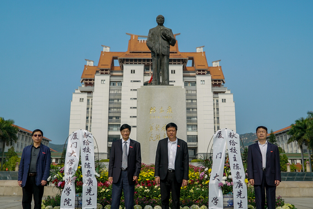上午九时,校领导、校友总会领导、校长助理、陈嘉庚先生后裔代表、校友代表和师生代表来到思明校区群贤楼前,祭扫陈嘉庚先生铜像,深切地缅怀他爱国爱校之深情和创办厦大之艰辛。