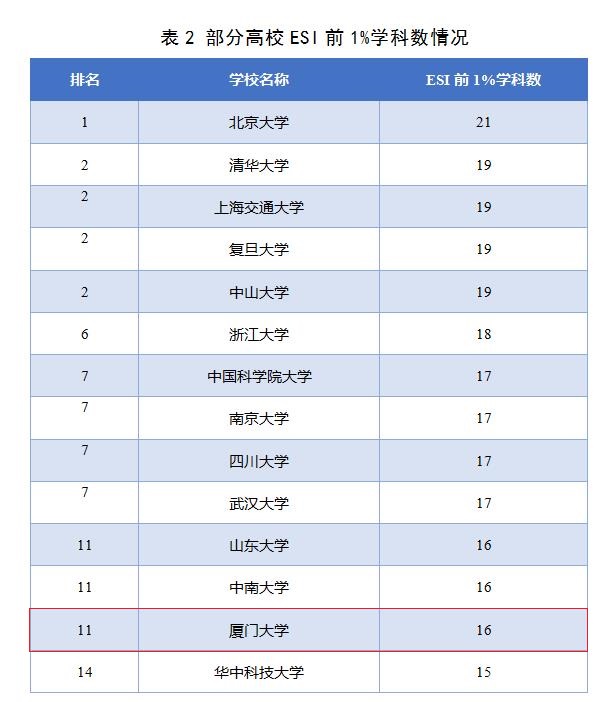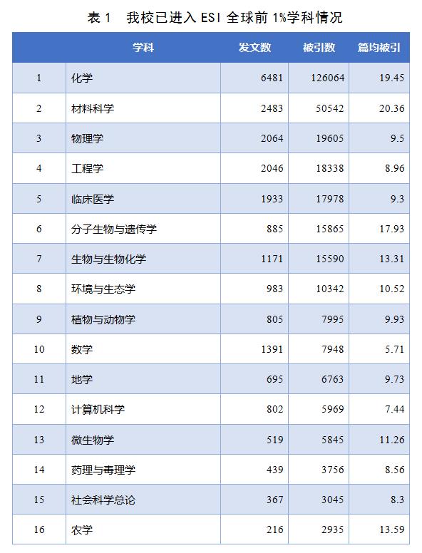 根据ESI数据库2019年3月公布的最新数据显示(数据统计覆盖时间为2008年1月1日-2018年12月31日),厦门大学新增物理学进入ESI全球前1%。至此,共16个学科进入ESI全球前1%,分别是:化学、工程学、材料科学、临床医学、植物与动物学、环境与生态学、生物与生物化学、数学、农学、社会科学总论、计算机科学、分子生物与遗传学、微生物学、药理与毒理学、地学、物理学,其中化学位列ESI全球前1‰。我校进入ESI全球前1%学科数位列中国大陆高校第11位。