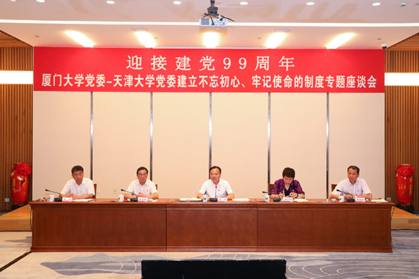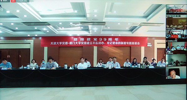 为深入学习习近平新时代中国特色社会主义思想,贯彻落实党的十九届四中全会精神和中央关于建立不忘初心、牢记使命的制度要求,6月30日下午,厦门大学党委和天津大学党委联合举办专题座谈会,以线上线下相结合的方式,交流研讨建立不忘初心、牢记使命的制度,共同探索进一步深化党建理论研究,推进高校党的制度建设,以一流党建引领一流大学建设。