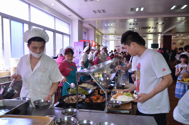 校园餐厅的食品卫生安全并没有因为放假而丝毫放松。每天例行的食品抽样监测、餐具消毒等依然有条不紊地进行着。中午十一点刚过,芙蓉餐厅已经人山人海,餐厅纪经理也亲自上阵兼当起服务员,还是忙得连口水都顾不上喝。负责洗碗的胡大姐已经一个多小时没坐下休息了。用餐人群中多了不少游客,许多吃完后没把餐具端回收碗车,而是留下满桌凌乱的餐具和残羹冷炙。于是洗碗工临时抽调来帮忙。胡大姐来回张罗,收盘擦桌,洗餐具,一直到下午三点,才算正式结束午餐服务。无论工作多累,遇上需要帮助的人,胡大姐都微笑着耐心解答。