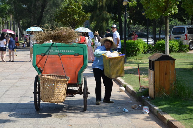 国庆期间,游客的涌入使得校园垃圾量每天平均增加2吨左右。后勤集团在日常保洁的基础上,每天抽调10名左右保洁员在校园巡回清捡乱抛乱丢的垃圾。而像黄秀群这样的“老厦大”在保洁部超过一半,他们勤劳朴实,在平凡岗位上无怨无悔、默默奉献着。