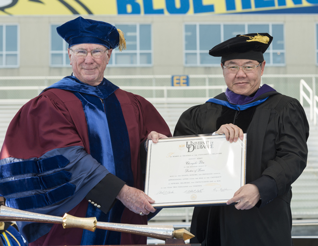 近日,应美国特拉华大学校董会主席A.Gilcbridt SparksIII和特拉华大学校长Patrick Harker的邀请,校长朱崇实应邀赴美出席特拉华大学第164期毕业典礼并接受特拉华大学授予的最高荣誉——荣誉法学博士学位。