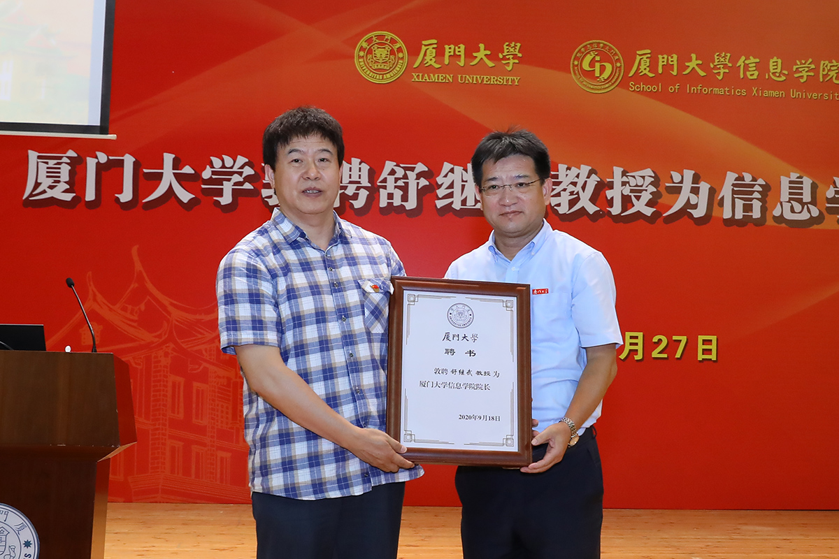 9月27日下午,学校在科学艺术中心举行简朴而隆重的仪式,敦聘舒继武教授为厦门大学信息学院院长。校党委常务副书记李建发代表学校宣读聘任决定。副校长江云宝为舒继武颁发聘书并讲话。