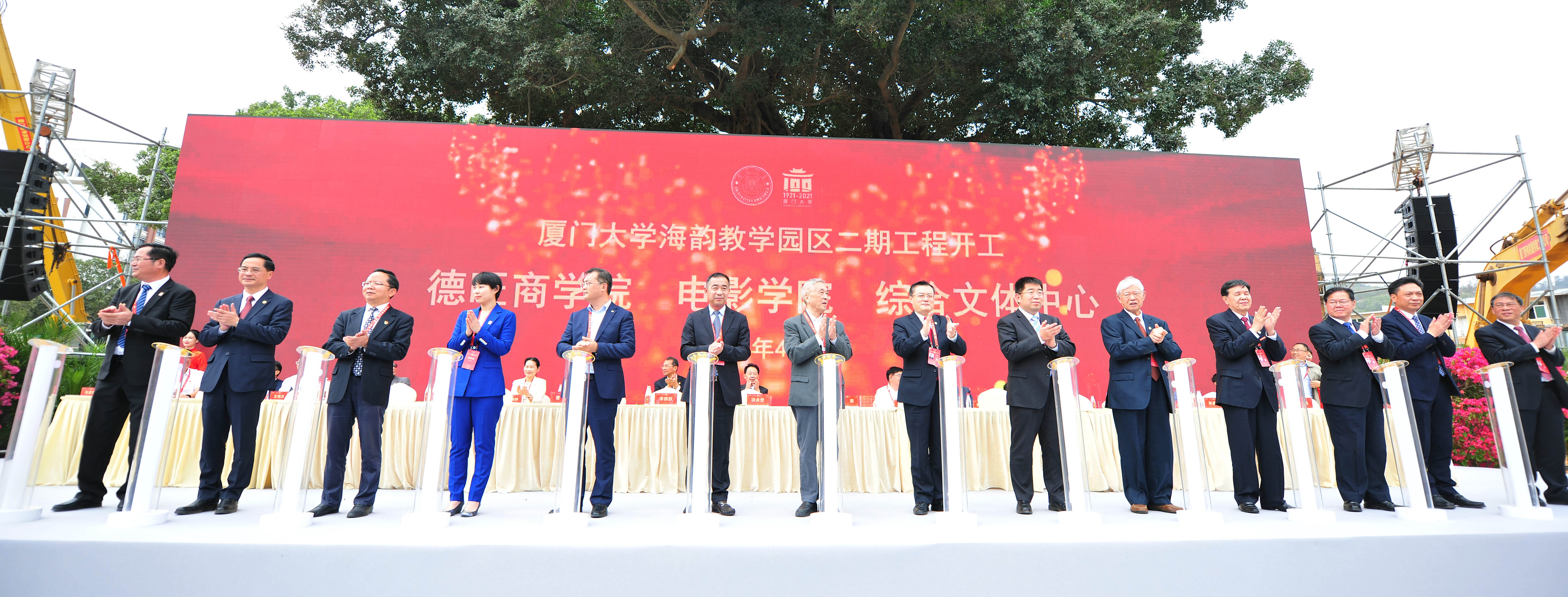 4月6日上午,值此厦门大学建校100周年之际,厦门大学海韵教学园区二期工程(德旺商学院、电影学院、综合文体中心)开工活动举行。厦门市原人大常委会主任洪永世,厦门市委常委、宣传部长李辉跃,厦门市人民政府副市长孟芊,福耀玻璃工业集团股份有限公司副董事长、第十三届全国政协委员、中国民主建国会中央委员曹晖及其夫人河仁慈善基金会副理事长武双,福耀玻璃工业集团股份有限公司宣传部长刘堃,河仁慈善基金会监事长陈石,马来西亚IOI产业集团中国区总裁、厦门公司总经理郑文良,马来西亚IOI产业集团中国区副总裁陈庆宏,厦门大学校长张荣,厦门大学原校长林祖赓,厦门大学原党委书记王豪杰,厦门大学原校长、校友总会理事长朱崇实,厦门大学党委常务副书记李建发,厦门大学副校长邱伟杰,厦门大学原党委副书记陈国凤,厦门大学原副校长、河仁慈善基金会副理事长吴世农,厦门大学原党委副书记赖虹凯,厦门大学校长助理张建霖、方颖出席活动。