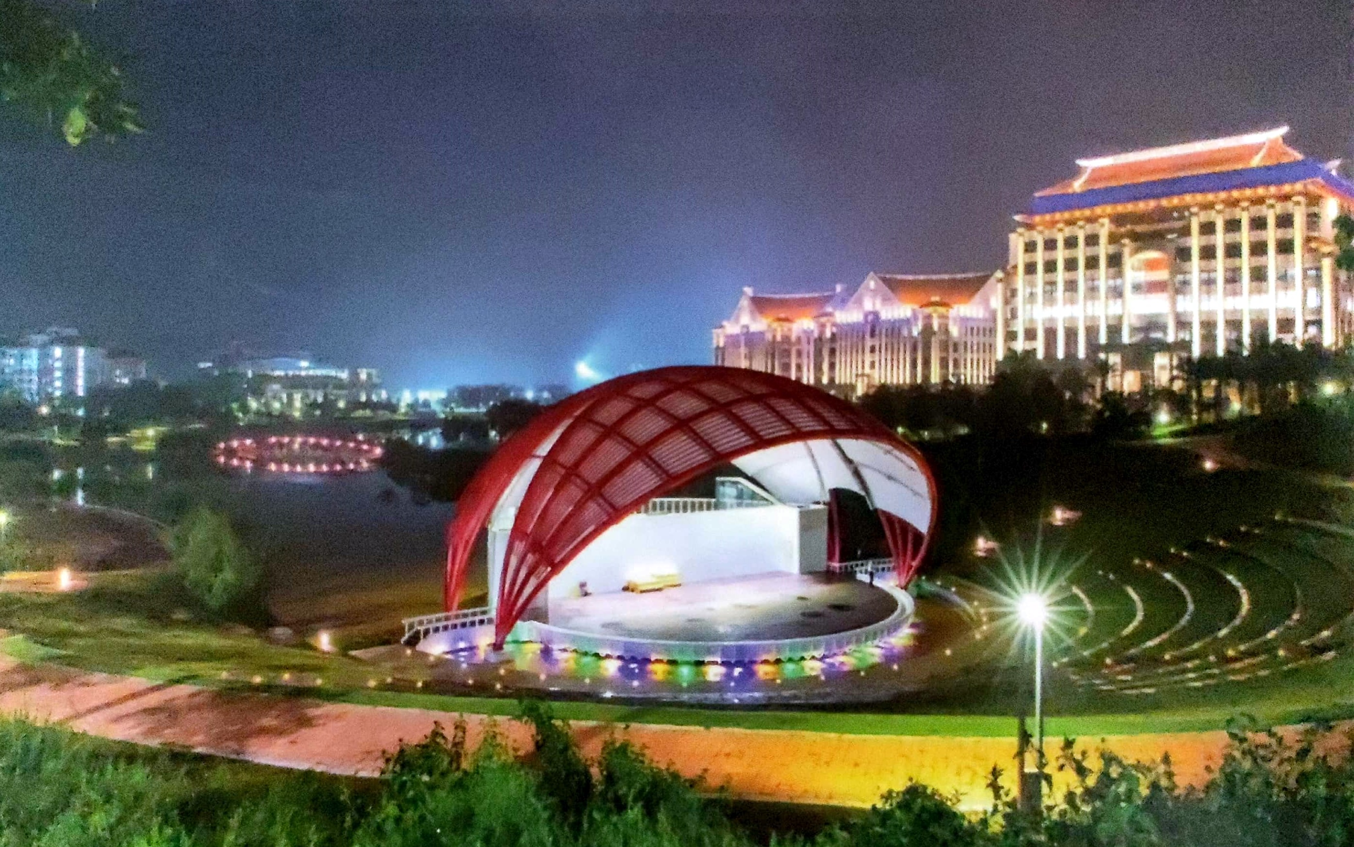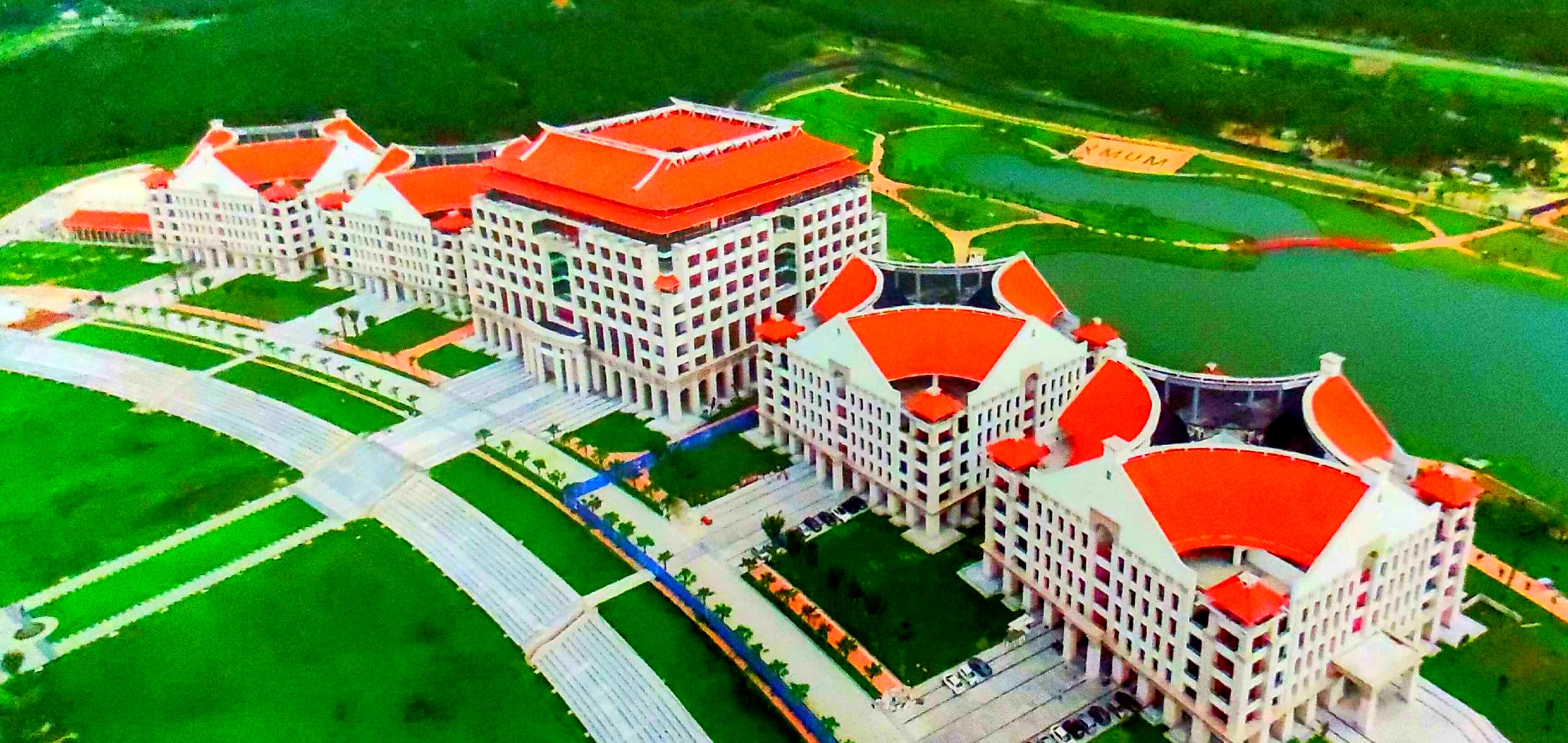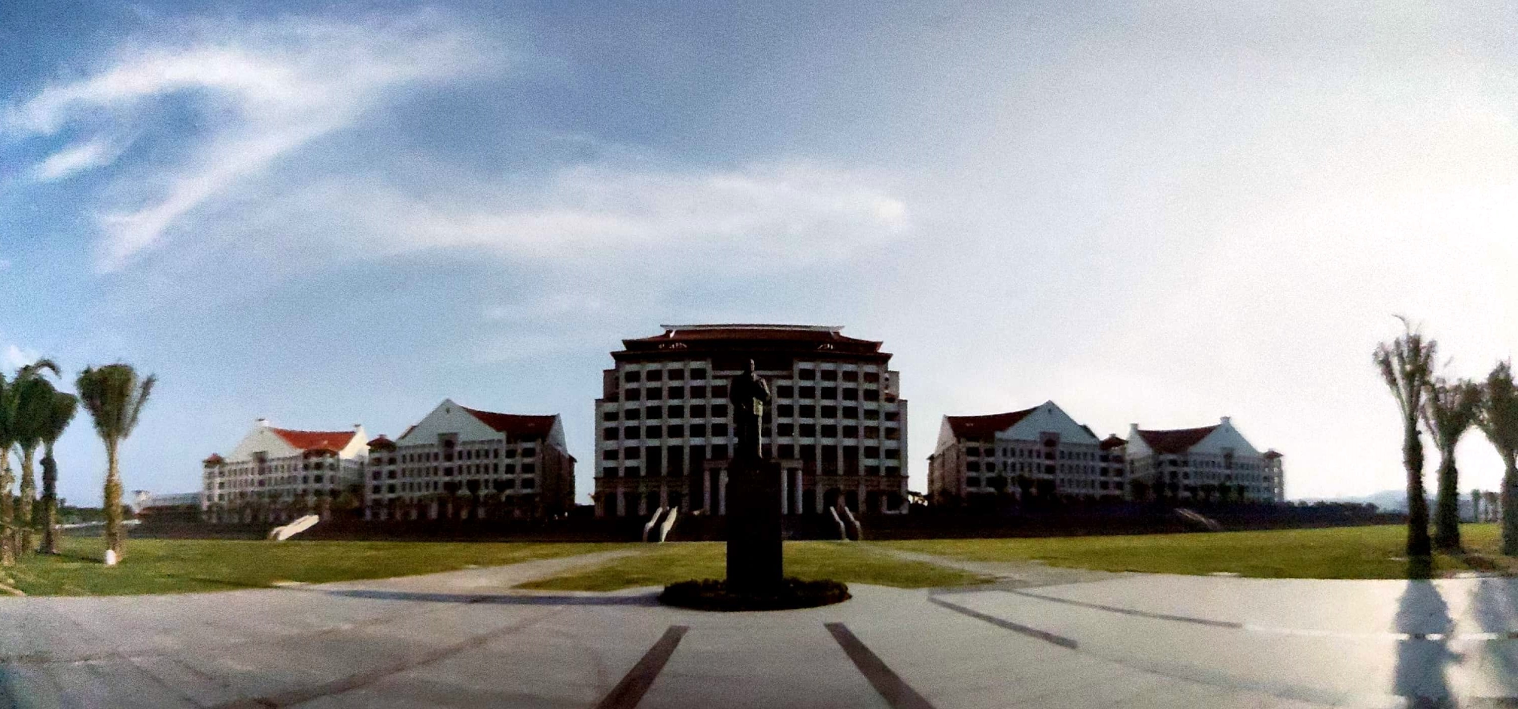 厦门大学马来西亚分校位于吉隆坡南郊45公里处的雪兰莪州沙叻丁宜,用地面积910亩,分为4个区,主要建筑物共计23栋。分校建设及规划有机结合了中马两国建筑之长,既吸取马来西亚当地部分传统特色,又传承厦大校园传统文脉,运用周边式布局方式,建筑以组团方式形成片区,延续“嘉庚建筑”风格,高低错落“一主四丛”式布局,采用“四个曲型扇面内倾”大坡面屋顶。校园道路和景观、绿化相结合,形成有序的步行系统,绿化环境与校园景观骨架为一轴一环布局,实现景观和水体结合的综合绿化系统。