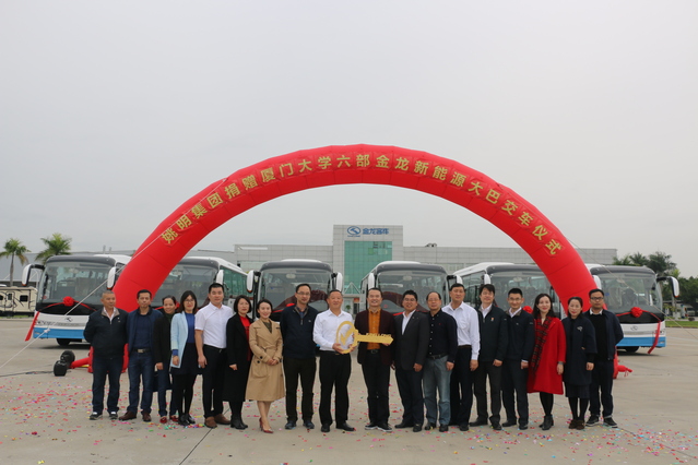 12月25日上午,在金龙集团总部广场,姚明集团再次为学校捐赠价值300万元的6部新能源大巴车。厦大85级校友、厦门校友会会长、姚明集团董事长姚明,后勤集团总经理林公明、党委书记刘立荣、副总经理王裕民,金龙客车销售总经理郑小虎、销售副总经理连伟吉,以及三方相关部门人员出席了交车仪式。