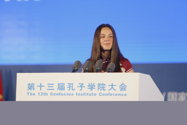 此外,作为此次大会开幕式上年纪最小的发言嘉宾, 我校共建的美国圣地亚哥州立大学孔子学院学员康可米受邀发言,用她的故事打动了在场许多人。12岁的美国女生康可米来自听障家庭,在美国圣地亚哥州立大学孔子学院下设河景国际小学孔子课堂里,她不仅学习中文和中文手语,而且经常在社区表演活动中担任小主持人,用中文、英文和手语进行三语主持。她说:“我也看到许多人从孔院获得无私的帮助,其中不少和我的父母一样有着这样和那样的困难。在这里,大家互相帮助,一起努力。我希望未来能够担任中美文化交流的使者,也能帮助更多需要帮助的人。”康可米发言结束后将自己亲手制作的贺卡赠送给孙春兰副总理。孙春兰副总理高兴地回赠汉语教材给康可米。开幕式上,历届“汉语桥”中文比赛冠军、“孔子新汉学计划”博士生等展现了汉语学习成果,曾就读于我校共建的尼日利亚纳姆迪•阿齐克韦大学孔子学院的优秀学生、2018年“汉教英雄会”冠军韩懋宇也和其他冠军一起上台,为与会代表带来精彩的演出。韩懋宇在纳姆迪•阿齐克韦大学孔子学院学习期间,不仅以高分通过汉语水平考试(HSK)6级,而且获得了奖学金赴中国留学。他的梦想是希望毕业后能当一名汉语教师,做一名中尼之间的文化使者。