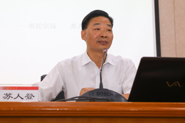 苏人登从7个方面解读了习近平总书记关于宗教问题和宗教工作的系列重要论述,从党和国家事业发展全局的高度,科学分析了当前宗教工作面临的新形势和新任务,并对党的宗教政策及新修订的《宗教事务条例》进行了深入解读,围绕“时代性”“政治性”“规律性”“两重性”“系统性”等特征畅谈心得体会,加深了大家对宗教政策法规以及当前国际国内宗教形势发展变化的认识。他指出,要深入学习贯彻习近平总书记关于宗教问题和宗教工作的重要论述,坚持“导”的正确态度和主张,坚持党的宗教工作基本方针,立足群众,重在基层,不断提高宗教工作法制化水平,构建积极健康的宗教关系。