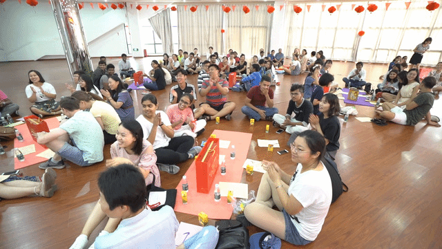 随着各组组长抱碗回桌,骰子在红釉陶瓷碗中叮当响,博饼活动正式拉开了帷幕。只见大家手起骰子落,满怀期待地盯着每一次结果,欢笑声此起彼伏。过了一段时间,各组便轮流爆出惊呼和掌声,不用说都知道,又是一个新的状元出炉。大家紧张地把脑袋探到一起,确认过眼神,再热烈地为状元们欢呼庆祝,现场一派喜气洋洋。不论国籍,不分语言,不计年龄,大家就这样自然而然地融为一体,笑着闹着。最后,十个小组分别产生数个状元,组内状元互相PK一夺花魁,十个状元齐齐亮相。每位状元手中都怀抱着博饼红碗,红碗中有象征着“团圆”的红柚,也把好运抱回去。