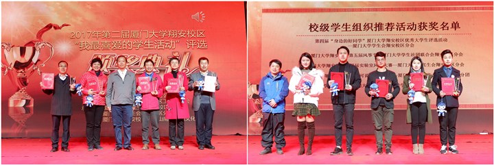 除了节目表演外,现场还进行了2017年第二届厦门大学翔安校区“我最喜爱的学生活动”评选颁奖典礼。评选活动自启动以来受到了全校区师生的广泛关注,经过报名初审、网络投票、学生代表投票、老师代表投票等环节,最终从48个报名活动中诞生10个我最喜爱的学生活动(学院推荐活动与校级学生组织推荐活动各5个):中西医结合义诊(医学院)、晨光初厦(航空航天学院)、假面舞会(环境与生态学院)、世界艾滋病日系列宣传活动(公共卫生学院)、汉语角(海外教育学院/国际学院)、第四届“身边的好同学”厦门大学翔安校区优秀大学生评选活动、厦门大学第五届风筝节、厦门大学第四届实验室风采大赛、厦门大学翔安校区“舞法可说”街舞专场、厦门大学翔安校区“百团大战”活动,陈光老师和张清榕老师分别为获奖代表颁奖。