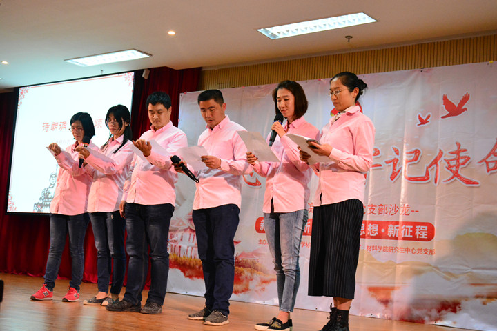 沙龙伊始,全体师生党员共同观看《新时代来啦》宣传视频,随后,2016级硕士党支部带来的《你画我猜》《谁是卧底》这两个游戏,引导大家乐想十九大报告关键词。生物材料教工党支部、材料科学教工党支部分别献唱《我的中国心》《众人划桨开大船》,慷慨激昂的歌曲掀起了现场大合唱热潮。博士生党支部党员代表围绕自身研究领域,讲述材料学子见证的砥砺奋进的五年。各支部围绕依法治国、社会主义核心价值观、生态文明建设、反腐等习近平新时代中国特色社会主义思想的内涵,或是用实验室、宿舍里的故事进行演绎,或是用求职、留学的经历进行讲解。