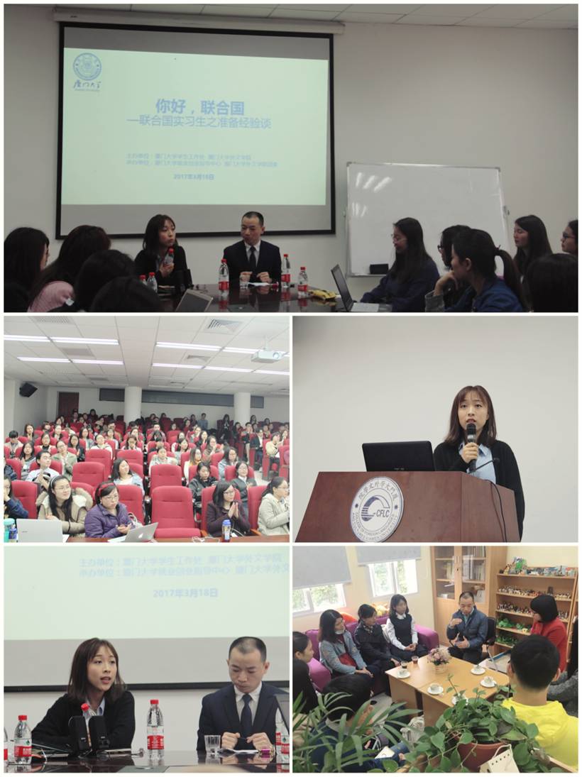 学校在3月中旬举办了首场国际组织相关活动——“国际派”之联合国实习经验交流。曾赴联合国总部实习的我校外文学院在读博士研究生陈谱顺和曾赴联合国人居署实习的我校外文学院2016届本科校友邵鸿靖两位同学应邀返校,通过“职”抒己见:零距离联合国人物访谈、“职”无不言:我眼中的联合国讲座、“职”上青云:你好,联合国沙龙等系列活动与在校生交流实习经验,分享实习期间的见闻与收获,为有意前往国际组织实习任职的厦大学子提供有针对性的指导与帮助。200余名同学报名参加系列活动,此次活动增强了参与同学对国际组织的认知,激发了他们到国际组织实习任职的热情。
