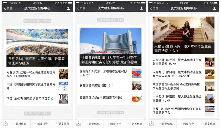 学校第一时间在学生就业创业指导中心网站开设国际组织信息专栏,广泛收集国际组织实习任职信息资源,与人社部、外交部、教育部等部门和其他高校推出的各类国际组织相关信息互联互通,利用好校友、专业老师和辅导员挖掘提供的各类信息,建立稳定的信息来源,实时发布国际组织实习任职岗位信息,共推送相关招聘、实习、活动、介绍等相关信息30余条;在“厦大就业指导中心”微信平台策划并推送宣传微信,其中《系列活动:“国际派”大佬坐镇,分享联合国实习经历》、《问卷反馈:这是一次充满正能量的国际组织任职意愿调查》、《干货:获取国际组织实习就业信息的网站》等推文阅读量达4000人次,同时也在i厦大、厦大易班等学生粉丝多的微信公众平台进行宣传推广;开通短信平台,定点推送相关信息,保障信息推送效率和利用率。