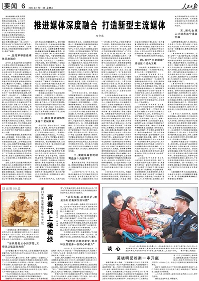 1月11日,《人民日报》第6版(要闻版)刊发题为“厦门大学法学院学生范天成:青春抹上橄榄绿”的通讯,讲述我校法学院本科生范天成“携笔从戎”书写无悔青春的故事。
