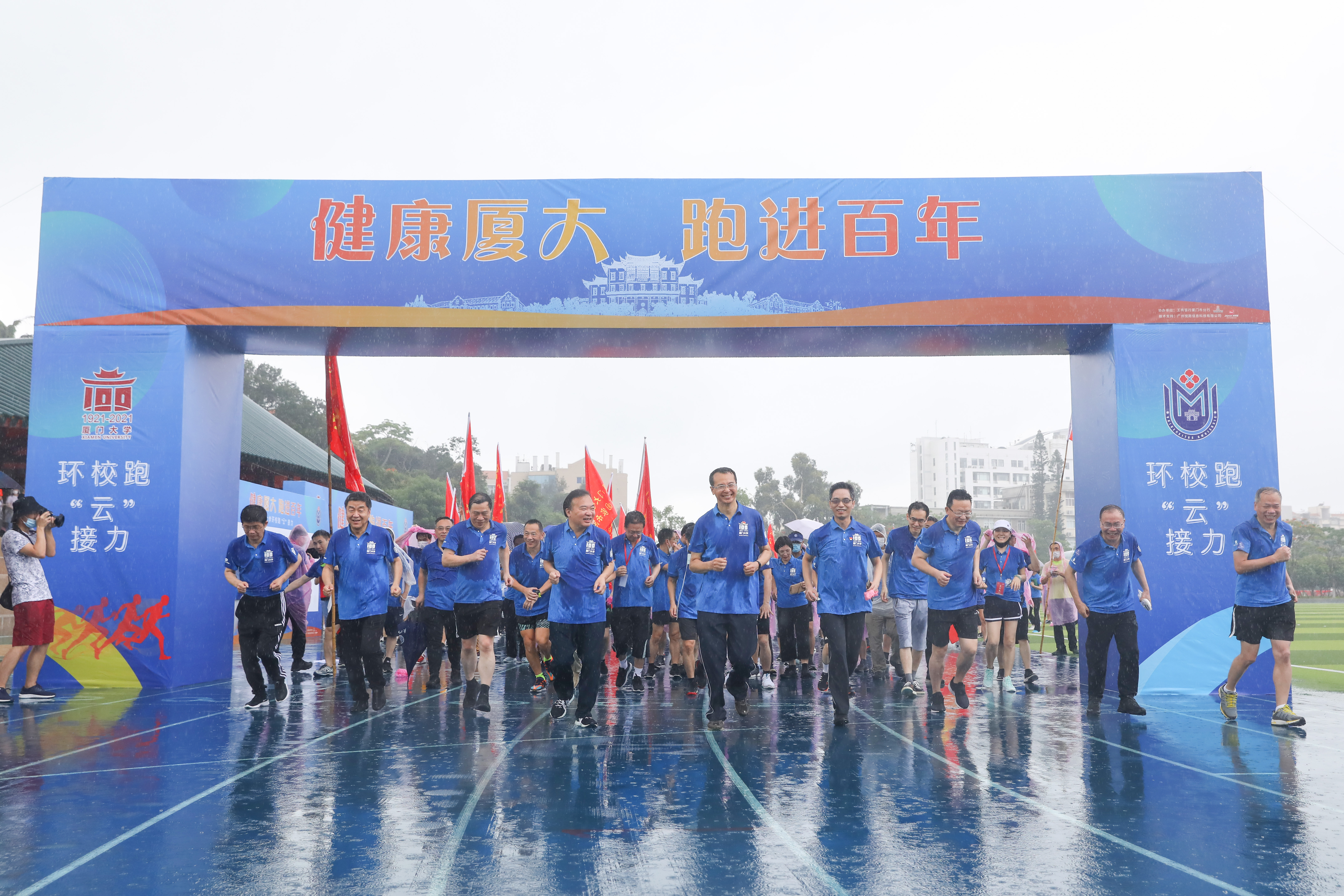 虽然活动遇雨,但大家的热情丝毫未减,随着发令员一声枪响,参加现场活动的校领导与师生代表首先在演武田径场环跑一圈,然后环校一周,途经陈嘉庚铜像、罗扬才烈士陵园、自钦楼、勤业餐厅、建文楼、图书馆、萨本栋铜像、王亚南塑像、囊萤楼,最后回到演武田径场。