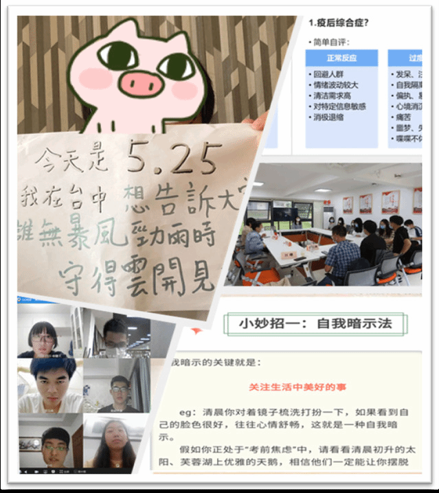 ——医学院举行班级心理健康教育展示暨心理委员述职大会,举办《正确处理疫情下的焦虑》心理大讲堂,从“心”开始目标达成打卡活动,并在“翔安南路青囊书”微信公众号为同学们推送心理调节小妙方;