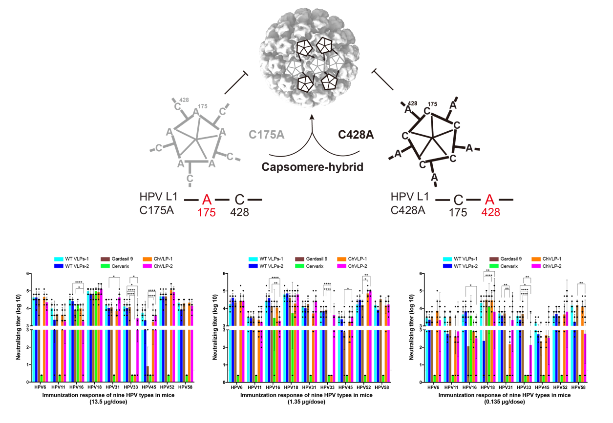 该研究首先将HPV L1蛋白上对VLP组装非常关键的175位和428位半胱氨酸分别突变为丙氨酸(C175A、C428A),结果显示单点突变后的L1五聚体无法组装形成VLP,而两个不同型别的L1-C175A五聚体和L1-C428A五聚体能杂合组装形成单一的杂合病毒样颗粒(chVLP),且最适的杂合组装化学计量比为1:1;冷冻电镜解析结果显示chVLP的颗粒形态与野生型VLP类似,均为T=7的二十面体对称结构;有趣的是,该杂合组装方式是一种不限HPV型别的随机组装,实验测试了2~9种不同型别的L1五聚体均可杂合组装成chVLP,理论上一个chVLP中能容纳72种不同型别的L1五聚体。使用单克隆抗体分析颗粒抗原性发现,chVLP在保留了大部分型特异性表位的同时也产生了不同于野生型的新表位。进一步使用该杂合组装策略将9种型别(HPV 6、11、16、18、31、33、45、52、58)的L1五聚体装配至单颗粒中形成9型杂合病毒样颗粒(nona-type chVLP),在小鼠模型中能诱导出与Gardasil 9®相当的针对9种型别的高水平的中和抗体滴度。研究者提出,如果将该杂合组装技术与团队前期设计的三型嵌合颗粒技术(tri-type chimeric VLP)相结合,理论上可以通过在单一chVLP上簇集216种型别的HPV中和表位而做成pan-HPV广谱疫苗,可涵盖目前鉴定的约200种型别的HPV。该项技术可有望应用于针对高变病原体和携带新抗原肿瘤细胞的疫苗设计以及可控的药物递送载体。