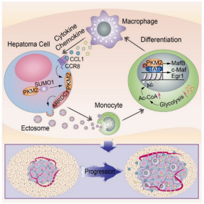 课题组首先提取了正常肝细胞和肝癌细胞的外泌体(Exosome)及微囊泡(Ectosome),将其分别与单核细胞共孵育,发现肝癌细胞的微囊泡而不是外泌体能够显著促进单核细胞分化。随后对这两种囊泡进行蛋白质组学分析,筛选到糖酵解通路的重要代谢酶PKM2(Pyruvate kinase M2)是肝癌细胞微囊泡中关键的传递蛋白。肝癌细胞能够以微囊泡的形式向单核细胞传递PKM2,显著上调单核细胞的糖酵解水平,引起单核细胞向M2-like巨噬细胞分化。探究细胞分化的分子机制结果表明,肝癌细胞微囊泡PKM2被单核细胞吸收后,能够作为代谢酶和蛋白激酶,“双管齐下”地上调单核/巨噬细胞分化关键转录因子(包括MafB、c-Maf和Egr-1)的表达,促进单核/巨噬细胞分化。