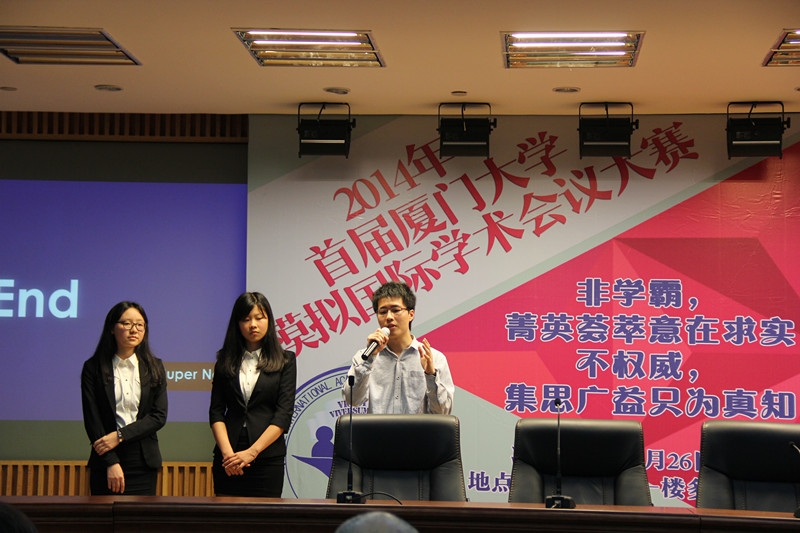 4月26日晚,由厦门大学教务处、厦门大学现代教育技术与实践训练中心与厦门大学外文学院主办,厦门大学外文学院英语语言文学系与外文学院团委承办的首届厦门大学模拟国际学术会议大赛决赛历时4个小时,在科艺中心多功能厅圆满落下帷幕。