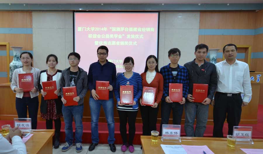 4月23日下午,厦门大学2014年“国酒茅台福建省经销商联谊会公益奖学金”颁奖仪式暨优秀志愿者表彰仪式在颂恩楼220会议室举行。校党委副书记林东伟、国酒茅台福建联谊会会长胡友慎出席并讲话。校团委副书记孙佳主持。