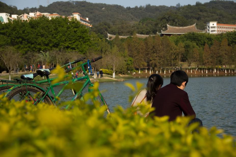 芙蓉湖畔,湖光山色,不时有学生情侣在此漫步,更增添几分浪漫与自在,停在一旁的小绿,也在静静地目睹着这一刻的幸福。