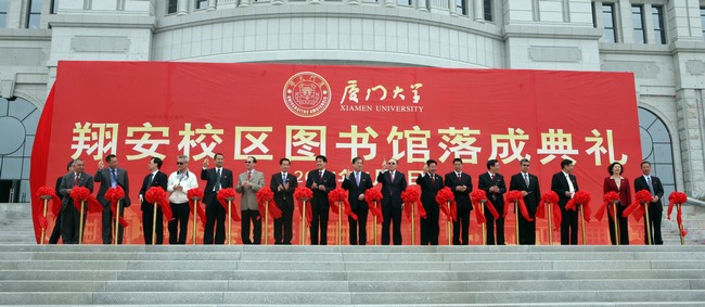 4月6日上午,在学校建校93周年之际,翔安校区图书馆正式落成。嘉里集团主席郭鹤年先生代表叶龙蜚,香港道德会会长何腾,副会长徐煜全,董事麦森,内地扶贫助学总督导张宪民,我校党委书记杨振斌,校长朱崇实,原校党委书记、校友总会理事长王豪杰,党委副书记、副校长李建发,党委副书记林东伟,副校长杨斌、邬大光、詹心丽、叶世满,校长助理张建霖、谭绍滨共同为翔安校区图书馆落成剪彩。落成典礼由校长助理李初环主持。