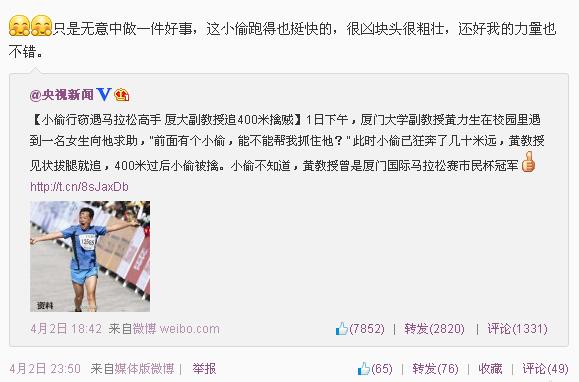 黄力生老师是厦门长跑界的名人,致力于长跑运动的普及与推广,是厦门公益马拉松训练营营长。2日晚上,他在其新浪微博上表示,“只是无意中做一件好事,这小偷跑得也挺快的,很凶块头很粗壮,还好我的力量也不错。”