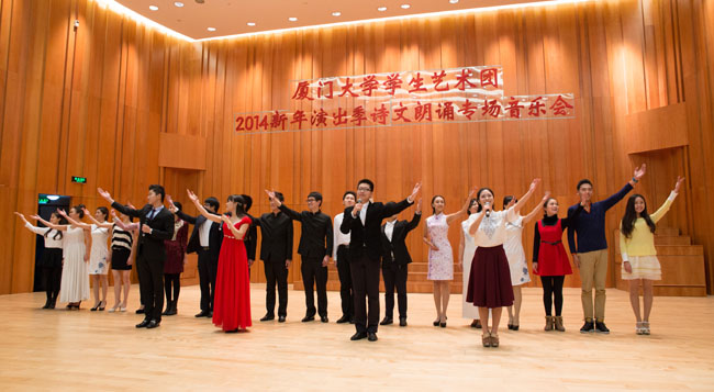 12月16日,厦门大学学生艺术团2014新年演出季第二场——诗文朗诵专场在艺术学院音乐厅举行,由艺术团主持人队的同学参与演出。