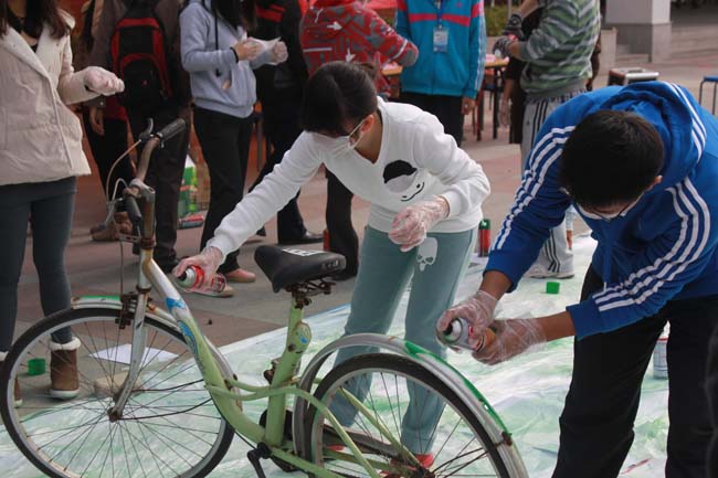 12月12日,翔安校区举行“小绿”维护美化活动。当天中午的竞丰餐厅广场,人潮涌动,一批还未喷漆的自行车被停放在塑料布上,它们主要来自思明校区利旧和老生捐赠的自行车,一群学生志愿者戴口罩手套给公共自行车喷上绿漆,挂上“使用须知”牌子,亲手为翔安校区制作出了新一批小绿,用实际行动践行小绿“实践、环保、奉献”的理念。