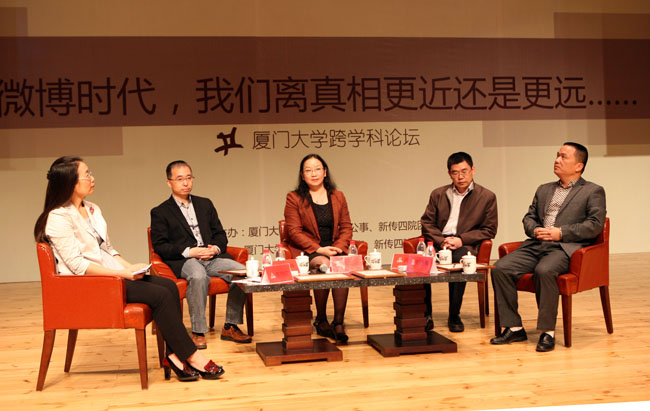 11月22日晚7点,由厦门大学法学院、公共事务学院、人文学院、新闻传播学院四院联合举办的首届跨学科论坛在科艺中心音乐厅拉开序幕。本次活动邀请到了中国法学会宪法学研究会理事、法学院刘连泰教授,人文学院副院长李晓红教授,MPA中心主任、公共事务学院黄新华教授,新闻传播学院副院长阎立峰教授担任嘉宾,法学院副院长李兰英教授担任嘉宾主持人,以“微博时代,我们离真相更近还是更远?”这一热门话题,吸引了大批听众,一票难求。