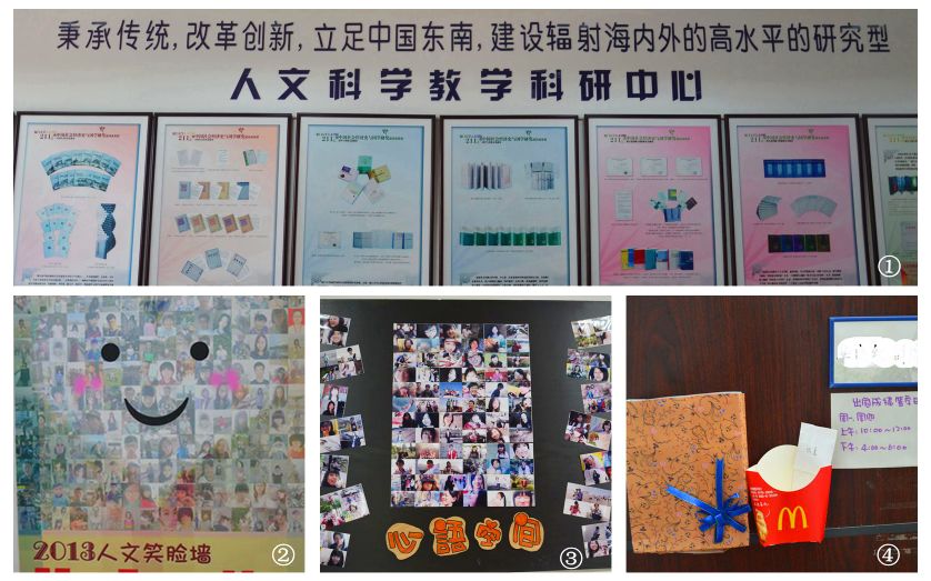 ②人文学院辅导员谢斌剑将该院2013级100多名本科新生照片做成笑脸墙,贴在自己办公桌旁的墙上,以便时时能看到这些可爱的学生。