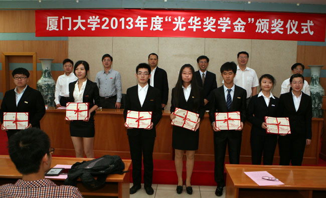 11月11日上午,厦门大学2013年度光华奖学金颁奖仪式在颂恩楼220会议室举行。48名研究生和12名本科生(其中包括2名少数民族学生)获奖。