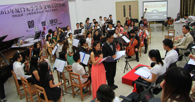 翔安校区的现实条件、学科特点和学生构成,决定了要实现这一理想需要有多大的勇气和付出多大的努力。乐团成立之初没有乐器,师生们自己动手维修艺术学院和校团委淘汰的旧乐器,没有排练场地,从学院活动室到公共教室,从地下车库到户外都曾留下同学们排练的身影,缺少相应的乐器演员,吉他手改练了小号,二胡手新学了中提琴,钢琴手兼打定音鼓,乐团的同学们尽可能利用课余时间抓紧训练,熟悉自己已稍显陌生的乐器,没有专业指导老师,乐团指挥彭兴跃教授利用自己教学科研之余为同学们编谱、指导训练、彩排,不辞辛劳。