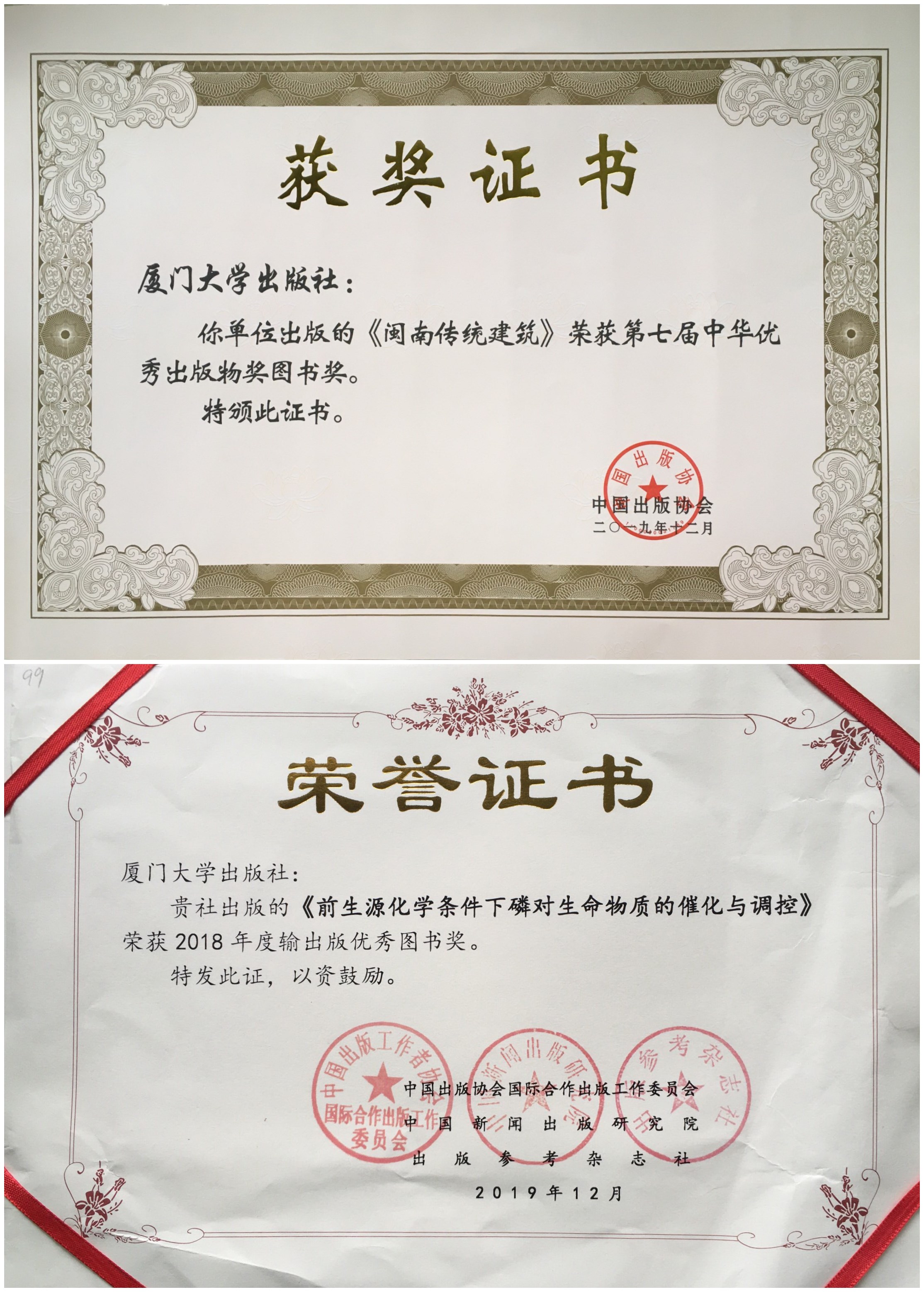 2019年所出版图书内容、编校印装质量精良,在新闻出版署、教育部、福建省新闻出版局开展的质检活动中,所抽检图书均无编校、印装问题。《清代巡台御史奏折汇编》、《福建理学史》、“改革开放40年法律制度变迁”获得国家出版基金资助、《习近平新时代中国特色社会主义经济思想的理论创新研究》等入选国家级出版规划、重点工程,《粤港澳大湾区协同创新机制研究:基于自由贸易组合港模式》等8个选题获省重点出版项目立项,《闽南传统建筑》获中国出版界三大奖之一的中华优秀出版物奖,《中国近代外债制度的本土化与国际化》获福建省第十三届社会科学优秀成果一等奖