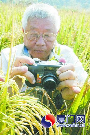 2006年11月8日,厦大生命科学学院王侯聪教授在位于漳州龙海的厦大农场观测优质水稻品种的长势。