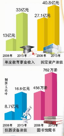 ●年度教育事业收入从13亿元增加到33亿元,固定资产总值从27.1亿元增加到40.8亿元,仪器设备总值从8.7亿元增加到16.8亿元,图书馆藏书从456万册增加到762万册。