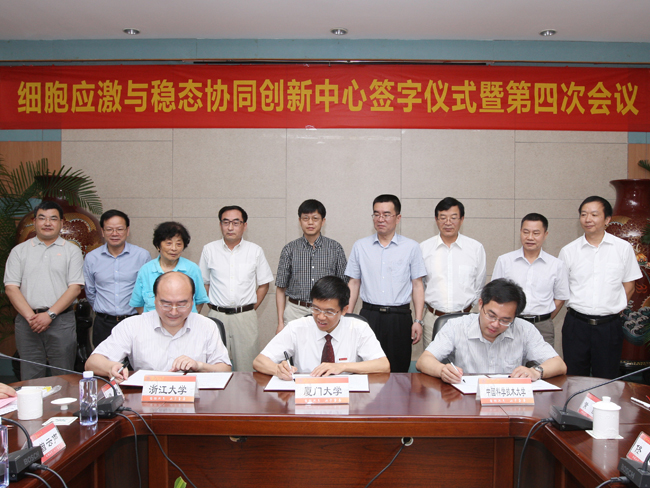 6月9日上午,厦门大学、浙江大学、中国科学技术大学联合在颂恩楼215会议室召开“细胞应激与稳态协同创新中心”签字仪式暨第四次会议。会议由厦门大学生物医学部主任、细胞应激生物学国家重点实验室主任韩家淮教授主持,我校副校长金能明、校长助理李清彪、浙江大学校长委托代表科研院副院长史红兵,中国科学技术大学校长委托代表科技处副处长朱霁平出席了会议。出席会议的还有厦门大学中科院院士唐崇惕教授、厦门大学各职能部门领导、三所学校生命科学院党政领导和教师代表。李清彪、史红兵、朱霁平分别代表三所学校在协同中心协议书上签字。