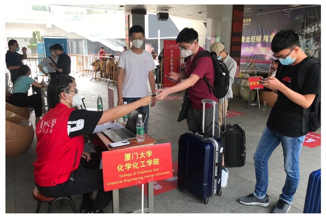 思明校区芙蓉和海韵宿舍楼下,公共事务学院准备了写着“‘公’候君来,万‘事’如意”的横幅,和码得整整齐齐的“健康大礼包”,让久违校园的学生们倍感亲切。新闻传播学院的迎新站点均竖起了醒目的立牌,精心制作的防疫礼包中物资丰富,口罩、福袋、专门为新传人定制的水杯,应有尽有。人文学院的健康包中还附有一张印着卡通图案的纪念明信片,信上写着:“鹏北海,凤朝阳。又携书剑路茫茫”给学生加油鼓劲。