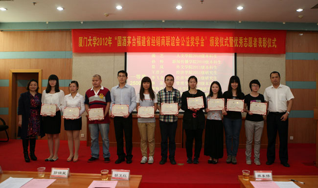 贵州茅台酒销售有限公司福建省区经理胡卫红、国酒茅台福建省经销商联谊会会长胡友慎、副会长陈玉清、副会长陈永明、秘书长王伟民、校团委书记陈怀锋、学生处副处长郭锦星、校团委副书记葛郝锐、孙佳参加本次大会并为获奖同学颁奖。
