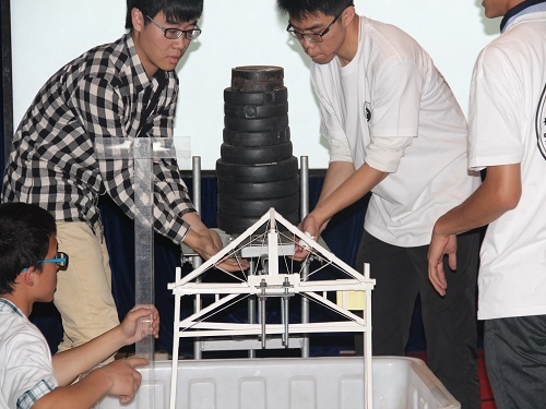 本次大赛的主题是“纸质偏心受载单跨门式结构设计”,来自全校各院系的参赛选手经过一个月的前期准备,对自己的模型进行多次试验后以最完美的状态接受比赛的考验。比赛分为四个环节——结构模型设计、结构模型制作、结构模型现场加载试验和PPT展示。评委会根据各环节选手们的表现,进行综合打分,最后评选出此次大赛的获奖队伍。经过了激烈的比赛之后,由土木工程系本科二年级学生组成的WWW队夺得了本次结构设计大赛的冠军。