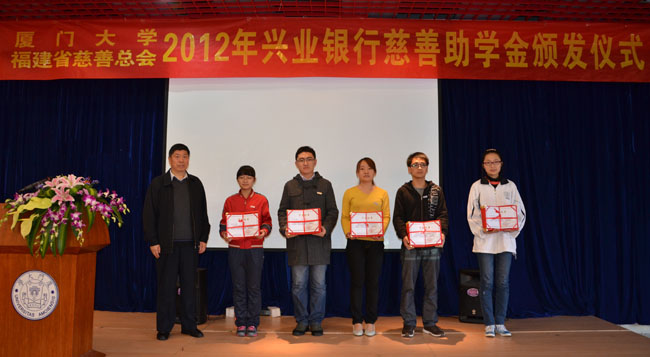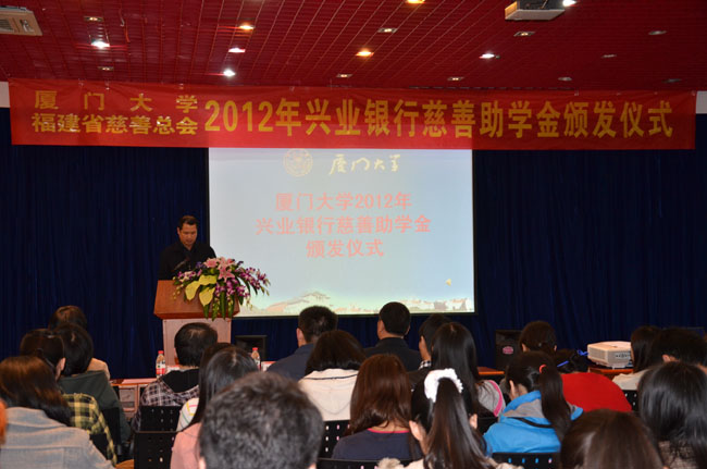 12月28日下午,厦门大学2012年福建省慈善总会“兴业银行慈善助学金”颁发仪式在自钦楼二楼多功能厅举行,我校100名家庭经济困难且品学兼优的学生获得每人4000元的资助。福建省慈善总会陈惠亮副会长、厦门大学党委副书记林东伟出席颁发仪式,仪式由学生工作处副处长郭锦星主持。