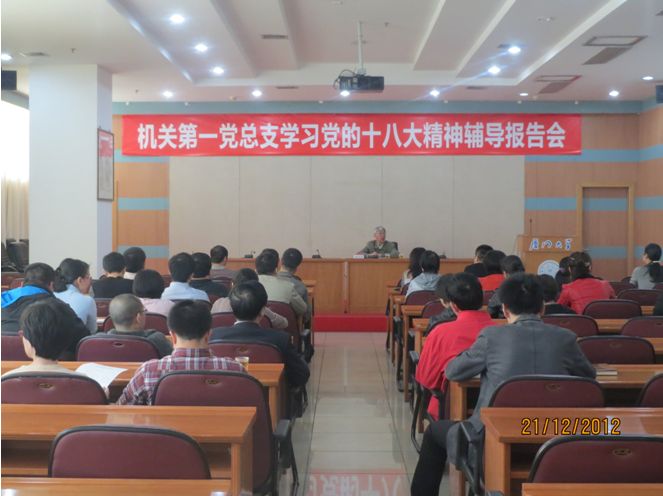 12月20日、21日,理论报告员洪成得教授应邀为机关第一党总支作题为“党的十八大精神解读——坚定三个自信,奋力实现两个百年目标”的辅导报告。洪成得从整体认识十八大、十八大报告的主题主线、夺取中国特色社会主义新胜利的八项要求、全面建成小康社会和全面深化改革开放的目标、全面提高党的建设科学化水平等方面,对十八大精神进行了深入浅出的讲解。学校办公室主任邱伟杰和校党委统战部部长林辉分别主持了报告会。