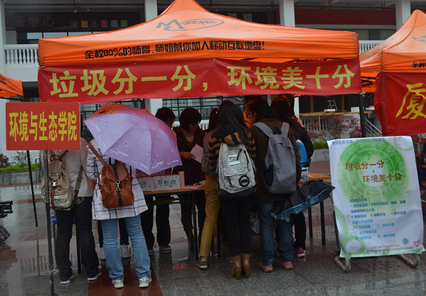 12月5日中午,由环境与生态学院团委主办、环境与生态学院青年志愿者协会承办的“垃圾分一分,环境美十分”垃圾分类宣传活动在翔安校区竞丰食堂前的广场顺利进行。环境与生态学院青协旨在通过实际行动向同学们宣传垃圾分类的相关知识,既响应了党的十八大报告中对“大力推进生态文明建设”的号召,在校园里宣传环保意识、推进生态文明建设,也在12·5国际志愿者日期间宣扬了志愿精神。