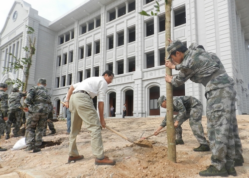 11月1日中午,医学院的国防生在主楼群1号楼附近植树种草。活动开始前,赖虹凯进行了动员讲话。他说,开展此次活动是为了进一步绿化美化新校区,以良好的卫生环境迎接党的十八大隆重召开。同时,也是为了更加牢固地树立同学们的主人翁意识,亲自参与新校区绿化美化工作。他表示,后勤服务的工友有的是同学们的父辈,有的是兄弟姐妹,通过这项活动,可以让大家体验到他们的艰辛,从而更加感谢和珍惜工友们和方方面面为同学们创造的良好工作、学习和生活条件,更加爱护翔安校区这个崭新的校园。他希望,通过校区国防生的植树种草活动起到榜样带动作用,让全校区的同学都参与到校区环境建设上来。