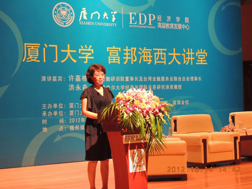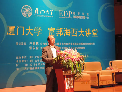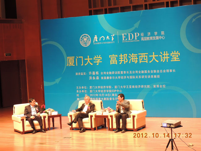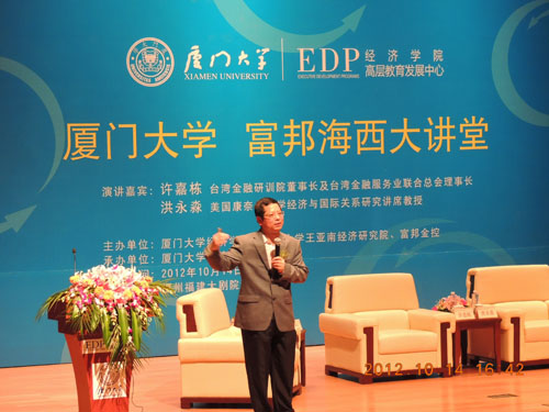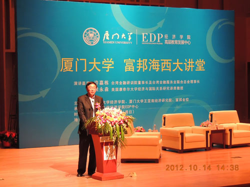 10月14日下午,经济学院EDP中心在福州市福建大剧院音乐厅隆重举办“厦门大学富邦海西大讲堂”。本次活动是该讲堂2012年度的第二场大型活动,由厦门大学经济学院、王亚南经济研究院和台湾富邦金控联合主办,经济学院EDP中心承办。台湾金融研训院董事长许嘉栋、美国康奈尔大学Ernest S. Liu经济学与国际研究讲席教授洪永淼分别作题为“全球化下的经济金融变局”、“从国际视角看中国经济增长模式的转变”的演讲。