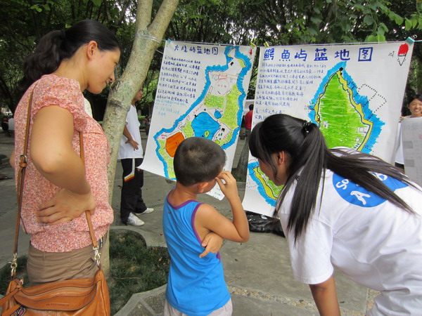 8月1日,“无冬之岛”实践队于中山公园开始本次实践活动成果的宣传。队员们展示了手绘的蓝地图,并对中山公园过路行人进行活动讲解成果展示。通过投影仪播放实践队自制无人岛活动纪录片,引得众多行人驻足观看。蓝地图是传统概念中绿地图在海岛的延伸,它用统一的图示,标注出自然胜景、动植物分布、基础建设、生态资源、环境资讯、交通步道甚至污染情况等十几类信息,共同组成一幅反映人文生态景观的综合图谱。