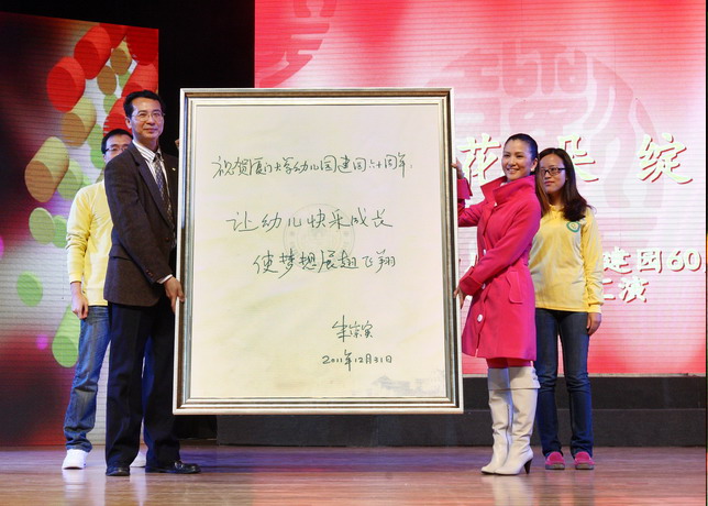 慈爱、成长、感恩,南强花朵绽放向太阳。1月8日下午,厦门大学幼儿园建园60周年庆典暨文艺汇演在建南大会堂隆重举行。幼儿园新老园友喜相逢,与昔日的老师们欢聚一堂,共话当年,展望未来。校长朱崇实特别为厦大幼儿园建园60周年题词:“让幼儿快乐成长,使梦想展翅飞翔”。