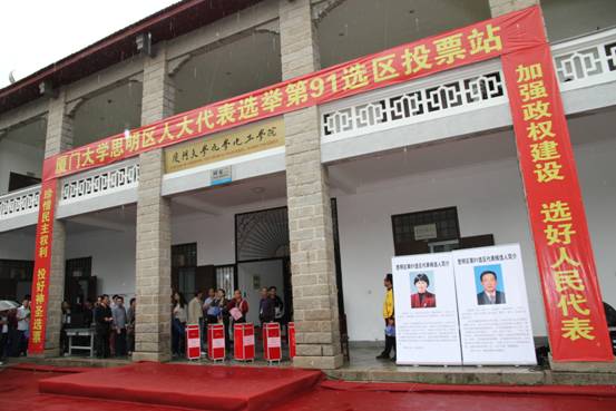 会场设于同安二楼前,红色票箱、两位候选人简介、宣传标语格外醒目。上午8点10分,第91选区第一场选举在化学化工学院金能明书记主持下开始。学院1800余名选民冒着大雨来到同安二楼前集合,按照大会要求,凭选民证领取选票,充分行使民主权利,依法选出自己满意的代表。选举过程气氛热烈,井然有序。
