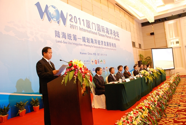 由中国国家海洋局、联合国开发计划署驻华代表处、厦门市人民政府、东亚海域环境管理区域项目组织、厦门大学等联合主办,多个国内国际相关政府、组织协办的“2011厦门国际海洋周”于11月在厦如期举行。“2011厦门国际海洋论坛”作为海洋周主要活动之一,于11月4日在海悦山庄海悦厅成功举办。本次论坛以“陆海统筹——规划海洋经济发展新格局”为主题,分三个专题分别从机遇、区域合作和技术支持等方面阐述了海洋经济发展中面临的各种挑战。国家海洋局党组书记、局长刘赐贵,福建省副省长倪岳峰,美国商务部助理部长、美国国家海洋与大气局副局长拉里•罗宾逊出席论坛并致辞,来自近40个国家和地区政府部门领导,10多个重要国际组织的代表,国内外海洋领域的专家学者等400余人出席了论坛。